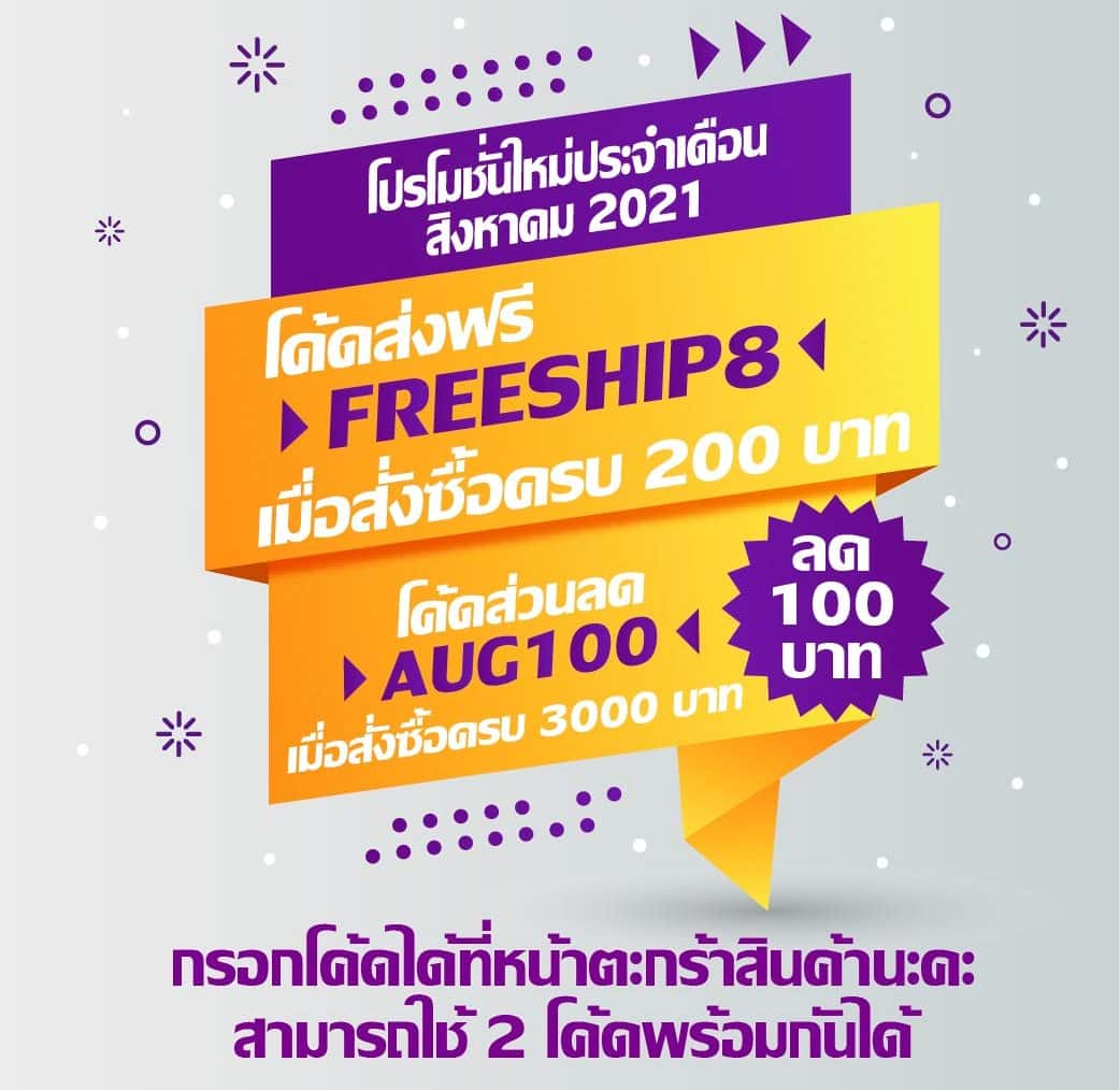 โปรโมชั่นที่1 : ส่งฟรีทั่วประเทศเมื่อสั่งซื้อครบ 200 บาท โดยกรอกรหัสคูปอง FREESHIP8 ที่หน้าตะกร้าสินค้า